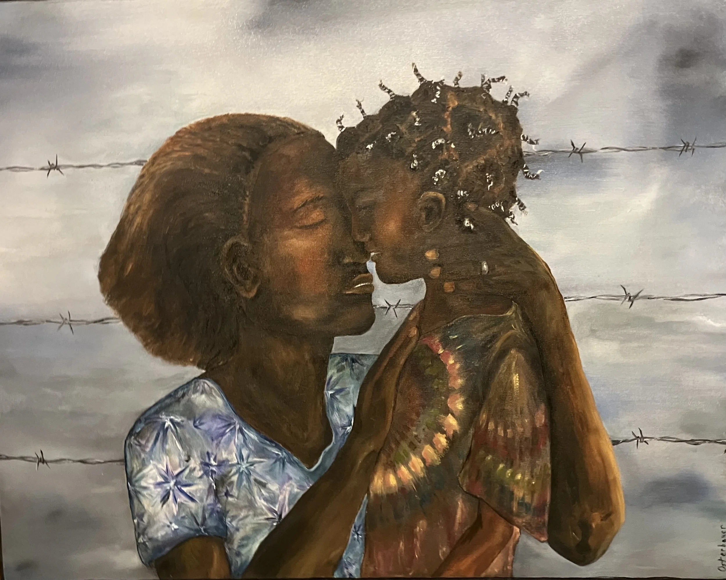 As a nurse who has worked in healthcare for 40 years, I’ve been committed to people’s well-being and the communities they live in. I believe diversity is integral to a healthy and vibrant community. With diversity under attack and the marginalization of large groups of our society, we are at a point in history where we cannot turn our backs or look away. My submission of a woman and child with barbed wire behind them represents the current plight of immigrants who have come to the United States.